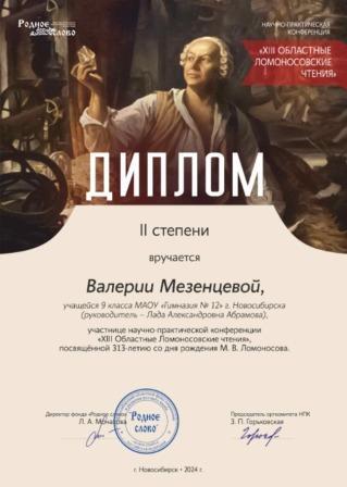 Лера Мезенцевой из 9А класса создала собственную методику анализа речи литературного героя, выпустила информативную брошюру с технологией выполнения подобных заданий и образцами характеристик речи героев "Кондуита и Швамбрании" великолепного писателя Л.А. Кассиля и ознакомила с ней одноклассников. Работа Леры "Речевая характеристика персонажа" была представлена на НПК "XIII Областные Ломоносовские чтения", по результатам которой Лера получила заслуженную награду - диплом II степени. Поздравляем Валерию и её научного руководителя, учителя русского языка и литературы Абрамову Л.А.